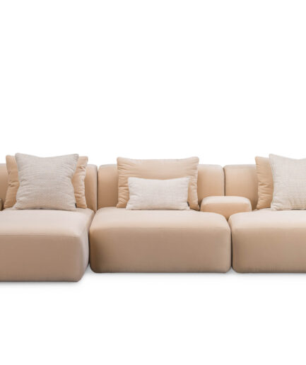 A estética baseia-se em linhas simples e uma paleta de cores dominada por tons neutros claros (branco e bege) que maximizam a luminosidade. O contraste e o calor são dados por toques estratégicos de laranja queimado e terracota em peças-chave, como o banco de entrada e as almofadas, ligando os diferentes espaços.