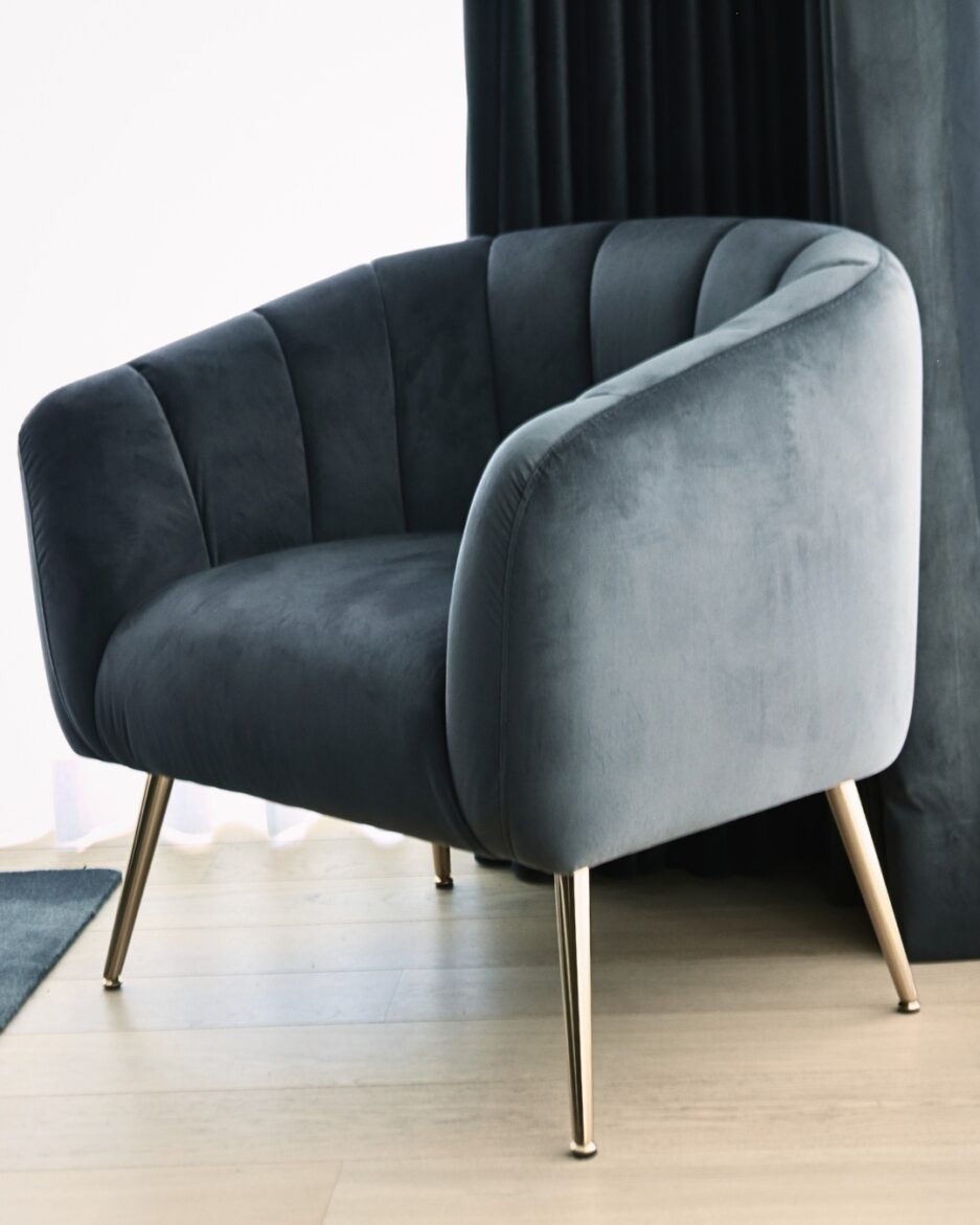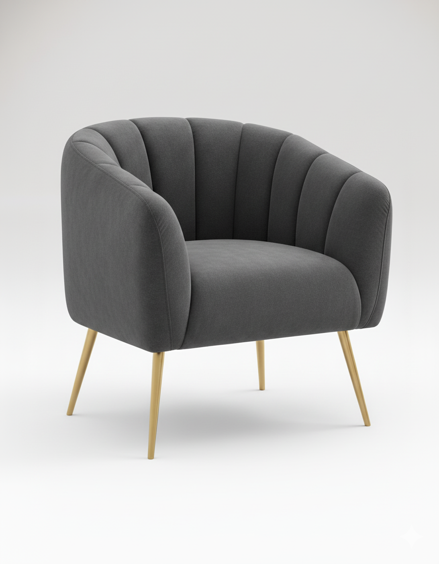 O Cadeirão Glamour combina linhas curvas e envolventes com uma construção robusta, garantindo tanto o conforto ergonómico como o impacto visual. O seu estofo é revestido por um tecido luxuoso em tom cinzento taupe , apresentando um distinto acabamento canelado (ou ribbed) no encosto. Esta textura não só adiciona profundidade, como realça a silhueta sofisticada da peça.