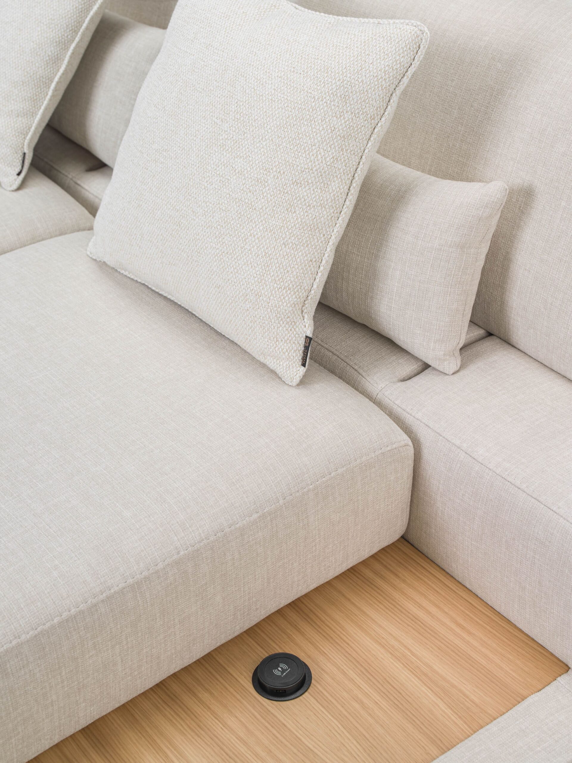 Eleve o nível da sua sala de estar com o Sofá Glamour. Unindo um design minimalista em tecido bouclé/linho texturizado com a praticidade da tecnologia moderna, este sofá retrátil inclui uma estação de carregamento sem fios (indução) e uma sofisticada base em madeira natural. O conforto premium que a sua casa merece.