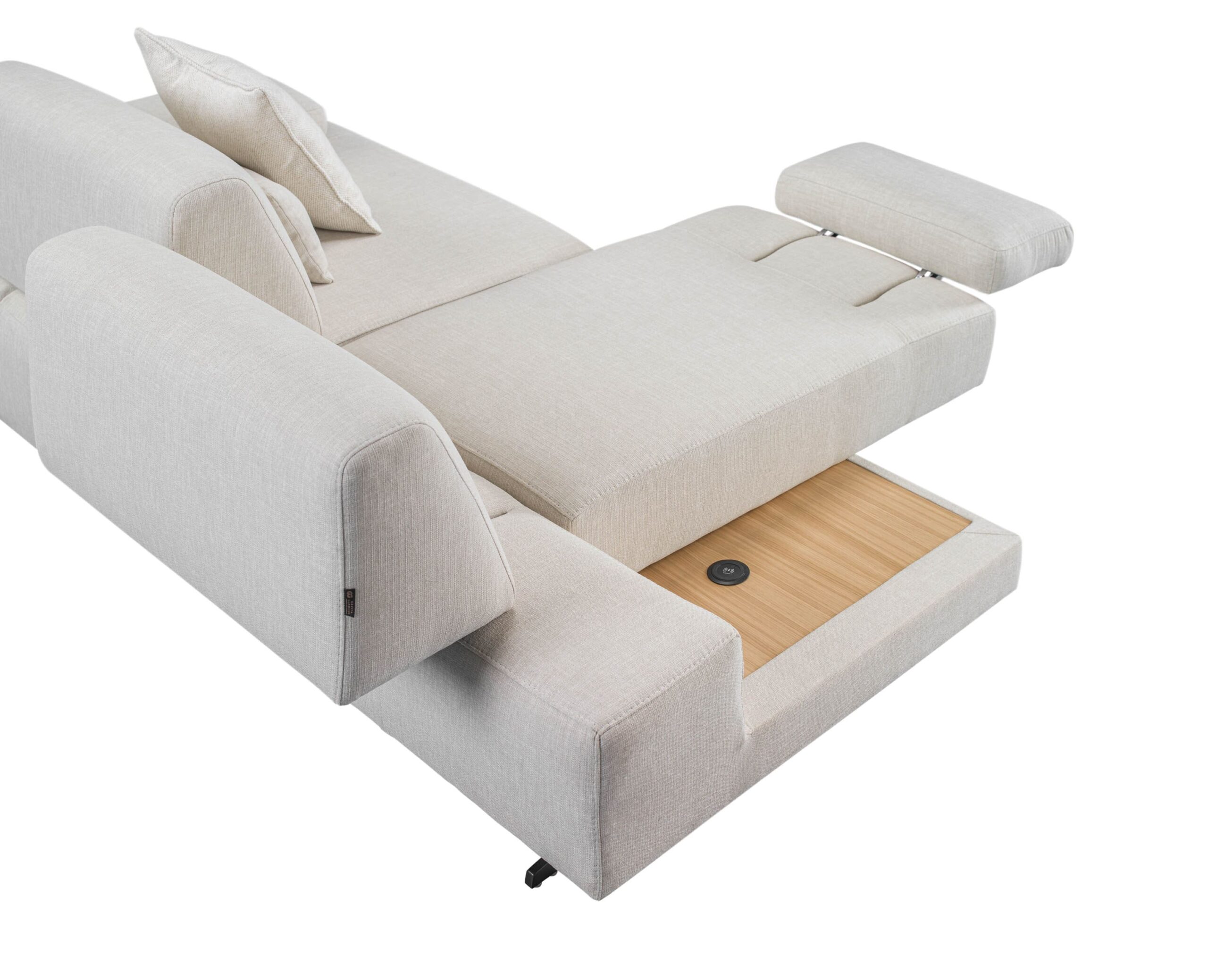 Espaço Inteligente: Quando aberto, revela uma superfície em madeira que serve como apoio para copos, livros ou dispositivos, eliminando a necessidade de uma mesa de centro volumosa.